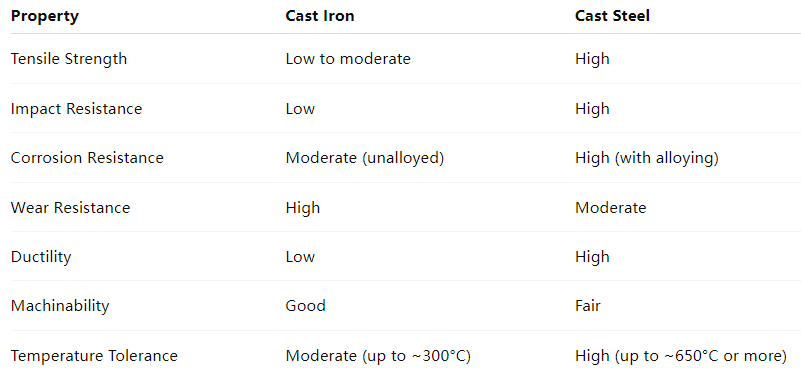 기계적 성능과 관련하여 주강은 거의 모든 측면에서 주철보다 성능이 뛰어납니다. 주강은 인장강도, 내충격성, 인성이 더 높습니다. 이러한 특성으로 인해 고압 및 고온 환경은 물론 기계적 충격과 진동이 발생하는 응용 분야에도 적합합니다.